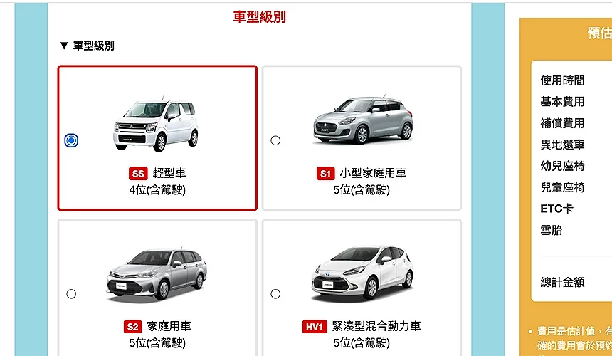 租車的費用主要由:租用時間、車種、以及附加設備、保險來決定。線上預約之前,建議先對行程有初步的規劃,才方便瞭解該預約什麼樣的車型以及取還車的地點。