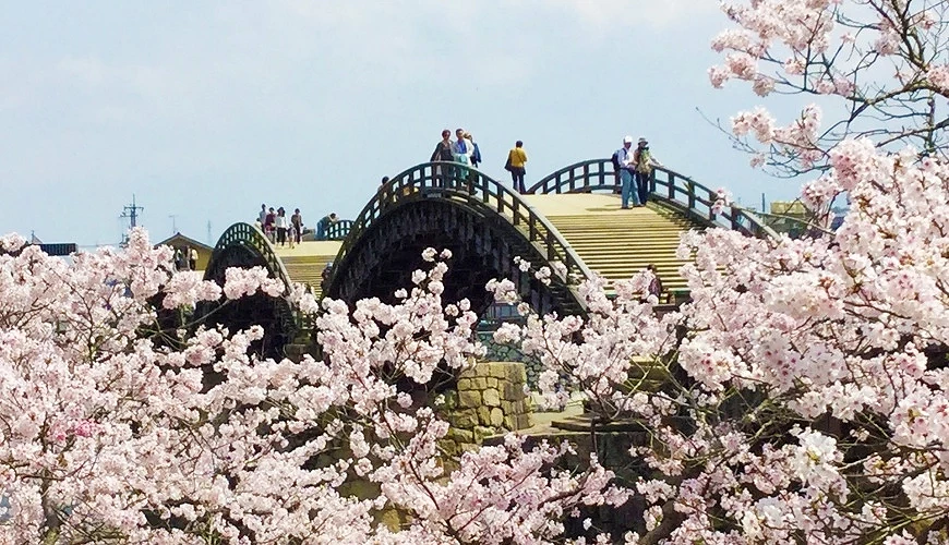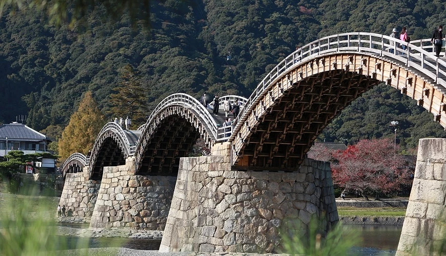 橫跨岩國市錦川的錦帶橋是「日本三名橋」之一,由第三代岩國藩主吉川廣嘉於1673年建造。這座橋擁有獨特的五個全木造結構拱形橋身,展現當時的高超建築技術,即使歷經多次重建,仍能抵抗湍急水流的設計著實令人驚嘆。橋身倒映在水面上的姿態別具魅力,無論搭配春櫻、紅葉或雪景,皆是迷人美景。
