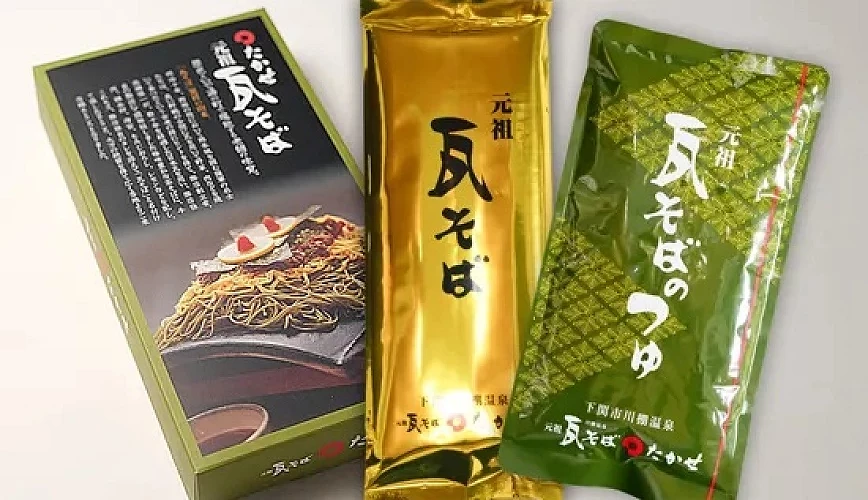瓦蕎麥是山口縣的知名美食小吃,現在也有推出方便攜帶與烹煮的乾麵套組,內含茶蕎麥麵、特製醬汁等材料。雖然在家中無法使用瓦片來加熱,但仍能如實重現其獨特的風味與口感,是許多人選擇帶給身邊親友的特色禮品。