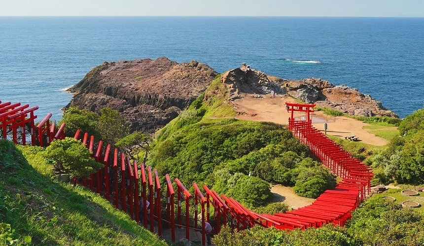 元乃隅神社以其沿著海岸線綿延超過123 座的朱紅色鳥居而聞名,被美國CNN列為「日本最美31處之一」。朱紅鳥居與湛藍海面、翠綠山巒形成了鮮明對比的夢幻景致。鳥居的起點可以欣賞海浪沖刷海蝕洞時的「龍宮潮吹」景觀,末端有一座高達6公尺的鳥居,據說只要能順利將香油錢投入鳥居頂端的賽錢箱,願望就能實現哦!