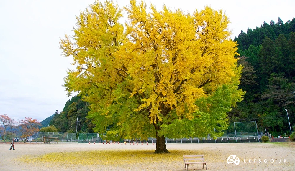 位於鳥取縣日南町的「舊日野上小學大銀杏」,是一棵樹齡超過百年的巨大銀杏樹,高達18公尺,秋季一到整棵染上金黃,地面鋪滿落葉,彷彿走進金色童話世界。每年11月上旬至中旬是最佳觀賞期,現場還會販售在地美食與限定小物,氣氛溫暖又浪漫,是秋天限定的絕美秘境景點!