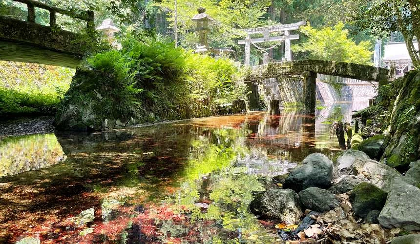 「別府弁天池」位於「別府嚴島神社」境內,除了人通過的鳥居之外,在池旁還佇立著一個只有供神明通過的鳥居,讓散發藍綠色光澤的池水更多了一份神秘的色彩。池水中還可以發現石頭上有瀕臨絕種的紅藻,只能生活在清澈水質之中的紅藻,也證明了這邊的好水質。