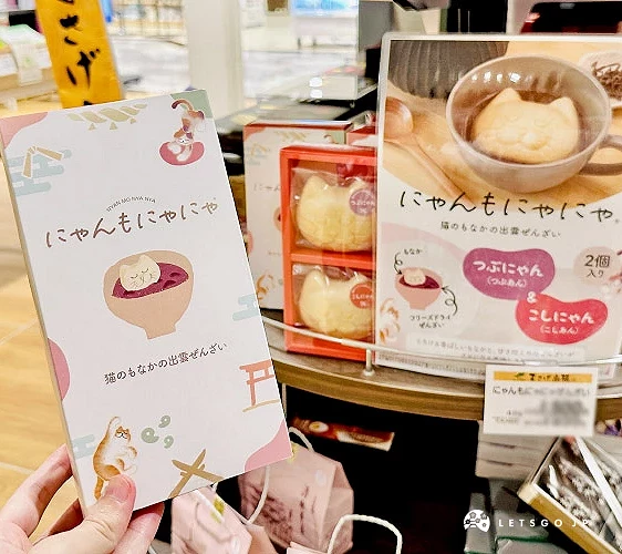 「DANDAN 橫町」(だんだん橫町)網羅各式各樣出雲在地伴手禮,從日式和菓子、餅乾到經典的「月與兔」(月とうさぎ)小饅頭一應俱全,還有許多以「結緣」為主題的可愛點心。特別推薦「Nyanmo NyaNya(にゃんもにゃにゃ)貓咪最中善哉」:「最中」是以糯米製成的香脆外殼,內餡包裹綿密紅豆餡;「善哉」則是出雲的名物麻糬紅豆湯。「Nyanmo NyaNya」將兩者結合後,只要沖入熱水,就能輕鬆在家品嚐到甜美療癒的出雲風味。既實用又討喜,絕對是旅途中必收的特色伴手禮!