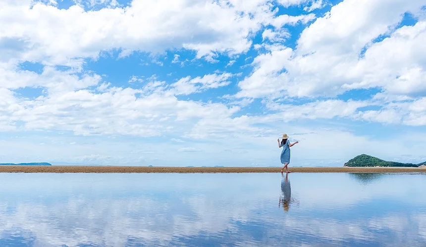 近年香川縣最知名的景點之一,莫過於能拍出夢幻美照的「父母濱海岸」!90年代地方居民為了反對填平海岸設置工廠的計畫,自發投入淨灘活動並延續至今,才得以保留這片美麗乾淨的沙灘。由於地形特殊,當退潮與日落的時間點重疊時,就可以利用退潮後積聚在沙灘的水池拍出「天空之鏡」美照。海邊不但有咖啡廳,還有一間精選香川縣特產的「百歲書店」,店內販售以地產食材製作的義式冰淇淋,一邊吃冰、一邊欣賞沙灘上的落日,超級享受!