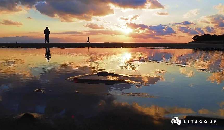 拍照小技巧:多數人來到海邊就會想往海面靠近,但其實能夠拍出絕景照片的,是在沙灘上一片片的水池。若是想要以夕陽為背景,夏天要在面海的左邊,冬天則是在右邊的水池拍攝。由於太陽下山前無風的時段最適合拍攝,建議出發前到官網確認退潮與日落重疊的日期與時間。
